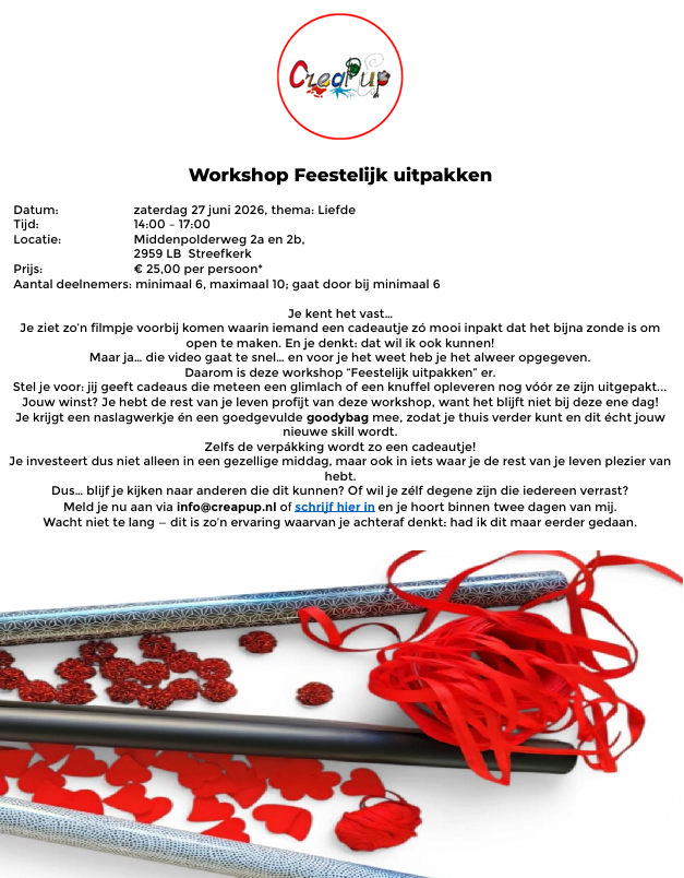 Stel je voor: jij geeft cadeaus die meteen een glimlach of een knuffel opleveren nog vóór ze zijn uitgepakt... Dat kán, nadat je de workshop 'Feestelijk uitpakken' hebt gevolgd. En het blijft niet bij deze ene dag! Je krijgt een naslagwerkje én een goedgevulde goodybag mee, zodat je thuis verder kunt en dit écht jouw nieuwe skill wordt. Zelfs de verpákking wordt zo een cadeautje!